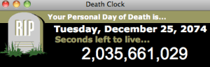 Acabo de enterarme que la fecha de mi muerte será el 25 de diciembre del año 2074.  Ya casi les cuento cómo lo averigüé, pero lo hice y según ese conteo, me quedan exactamente 2035 millones de segundos para terminar de lograr todo lo que tengo ganas de alcanzar en esta vida.